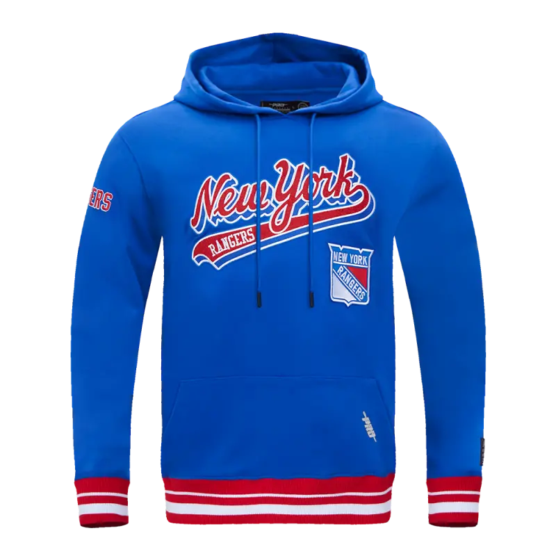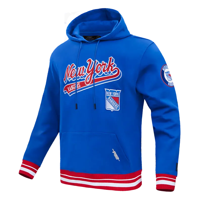 NHL NEW YORK RANGERS SCRIPT TAIL MEN’S RIB FLEECE PULLOVER HOODIE (ROYAL BLUE\/RED)