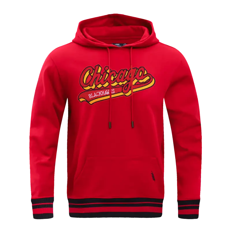 NHL CHICAGO BLACKHAWKS SCRIPT TAIL MEN’S RIB FLEECE PULLOVER HOODIE (RED\/BLACK)